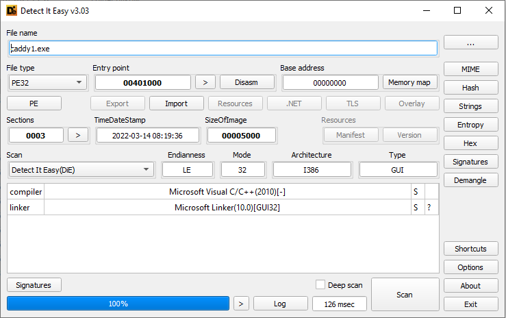 Poniższa analiza dotyczy próbki o sumie kontrolnej SHA256: a294620543334a721a2ae8eaaf9680a0786f4b9a216d75b55cfd28f39e9430ea i nazwie pliku caddy1.exe. Analizowany plik to 32 bitowa aplikacja, rozpoznawana jako posiadająca interfejs graficzny (GUI32).