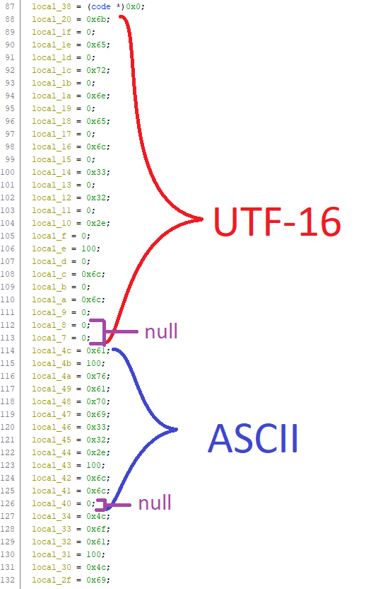 Dodatkowo, wszystkie potrzebne biblioteki są ładowane na początku funkcji entry i wywołania LoadLibraryA.