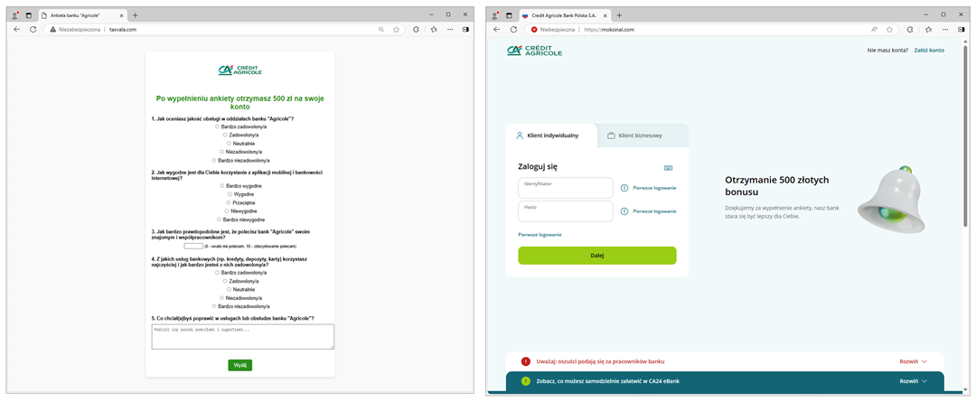 Another campaign from the past month, in which cybercriminals exploited the image of a Polish bank, involved impersonating Credit Agricole. Under the pretext of completing a survey, for which victims were allegedly promised financial compensation, the attackers stole login credentials for online banking.