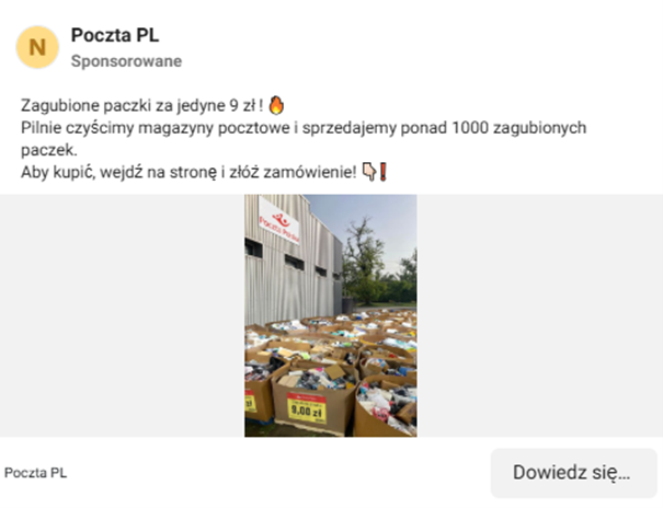 Once again, cybercriminals attempted to siphon funds from accounts using a "subscription model." This time, they published ads on the Facebook platform, claiming that users could purchase an unclaimed package for only 9 PLN (fig. 8).