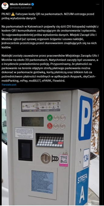 As reported on the "City of Katowice" profile on platform X (https://x.com/miasto_katowice), on November 20, 2024, stickers with QR codes were found on local parking meters. Scanning the QR code led to a website designed to steal personal data (fig. 13).