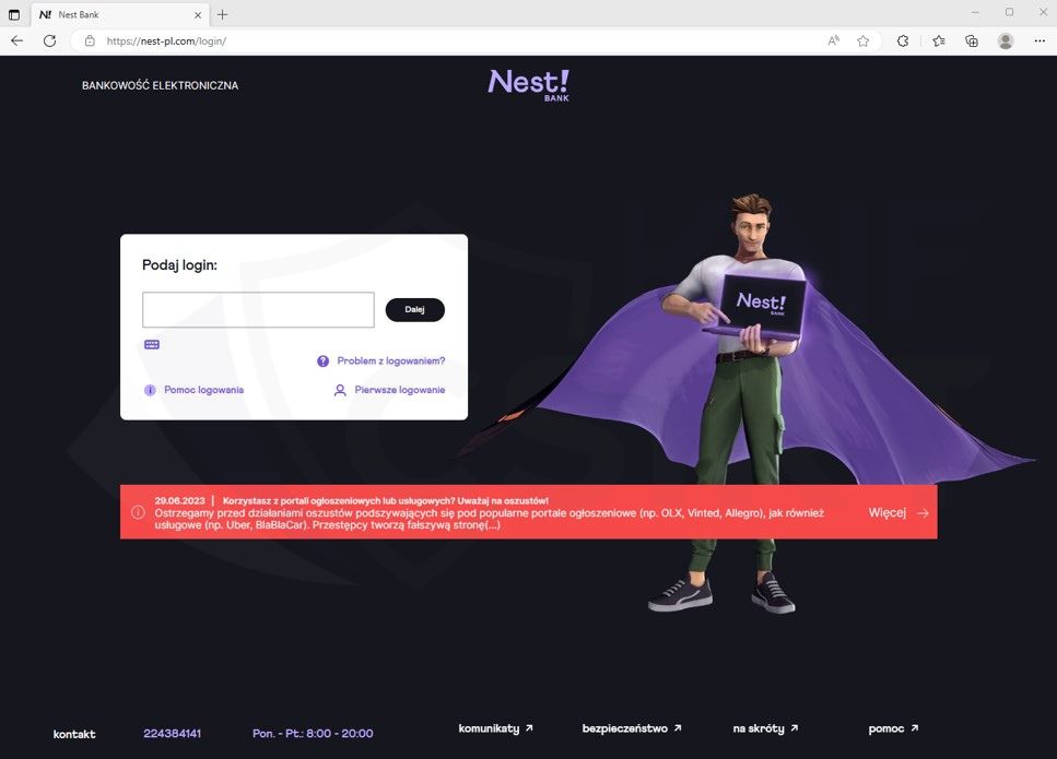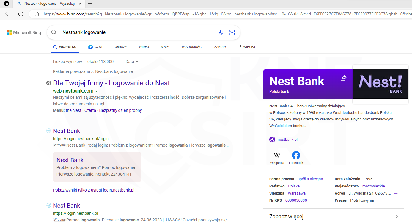 W czerwcu 2023 roku zidentyfikowaliśmy kampanię phishingową podszywająca się pod Nest Bank. Przestępcy dystrybuowali strony phishingowe przy wykorzystaniu reklam w przeglądarce Microsoft Bing. Do tej pory nie identyfikowaliśmy wykorzystywania przez atakujących tego miejsca dystrybucji. Sam sposób, jakim jest wykupywanie reklam, celem wyższego pozycjonowania stron, jest już znanym (od kilku miesięcy) działaniem przestępczy.