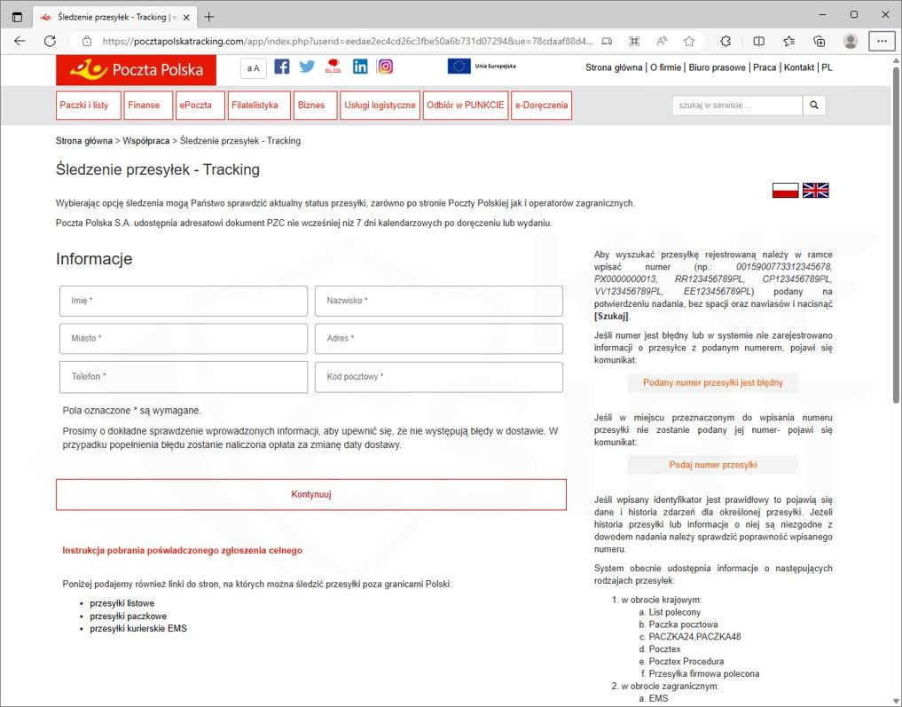 Rysunek 9 Strona podszywająca się pod Pocztę Polską 1/3