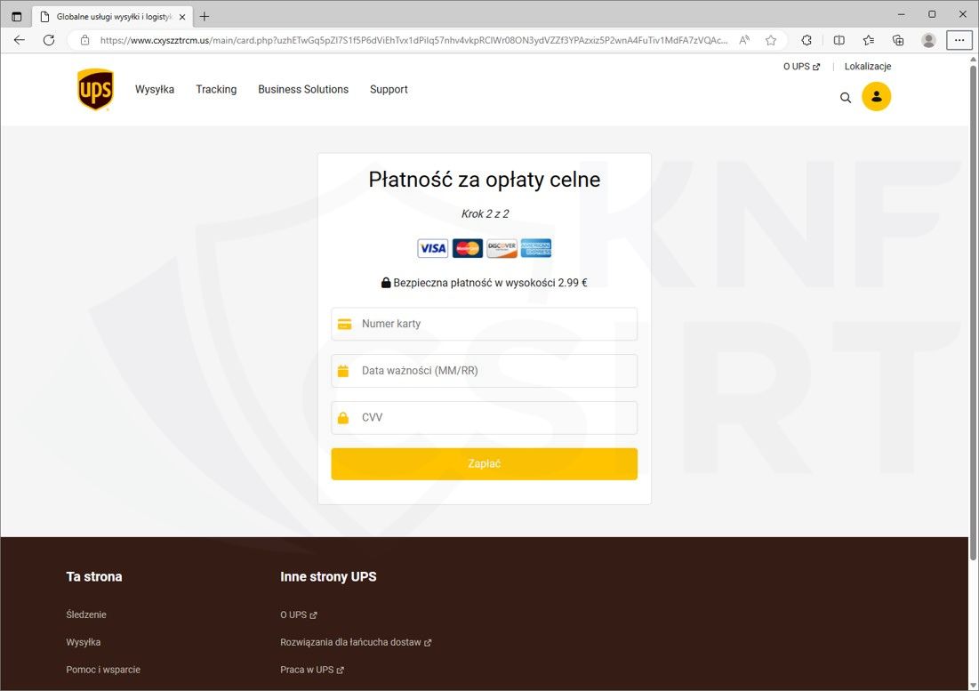 Cyberprzestępcy podszywając się pod firmy kurierskie UPS oraz DHL rozsyłali wiadomości SMS informując o rzekomych problemach logistycznych oraz potrzebie uiszczenia opłaty celnej. W wiadomości znajdował się link, po kliknięciu w niego ofiara trafiała na stronę, na której zachęcana była do wprowadzenia danych karty płatniczej (pełen numer, data ważności, kod CVV), kodów 3DSecure.