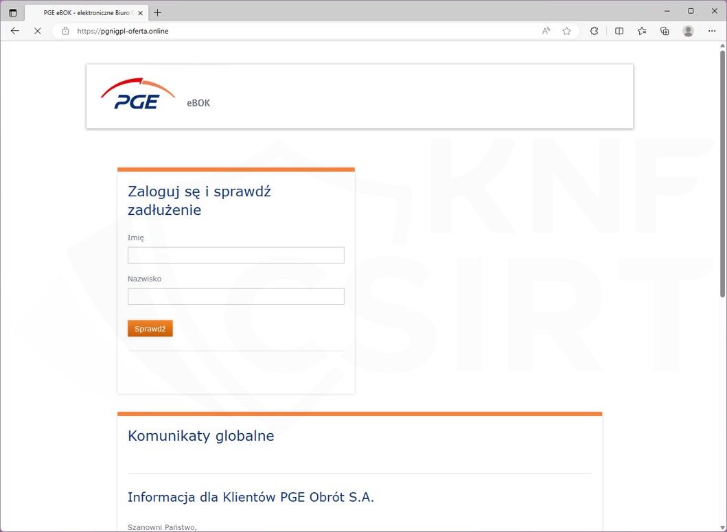 Rysunek 27 Strona phishingowa podszywająca się pod dostawcę energii elektrycznej 1/3