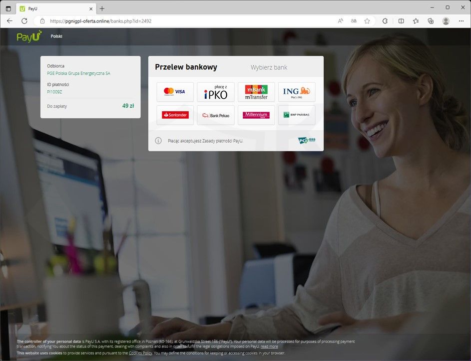 Cyberprzestępcy podszywając się pod dostawców energii elektrycznej przeprowadzili kampanię phishingową, informując o rzekomym długu, w wyniku nieopłacania rachunków oraz potrzebie szybkiego uregulowania płatności. W wiadomości zawarty był link do fałszywej strony, na której wyłudzane były dane osobowe oraz informacje o karcie płatniczej (pełen numer, kod CVV, data ważności, kody 3DSecure) i/lub poświadczenia logowania do bankowości elektronicznej.