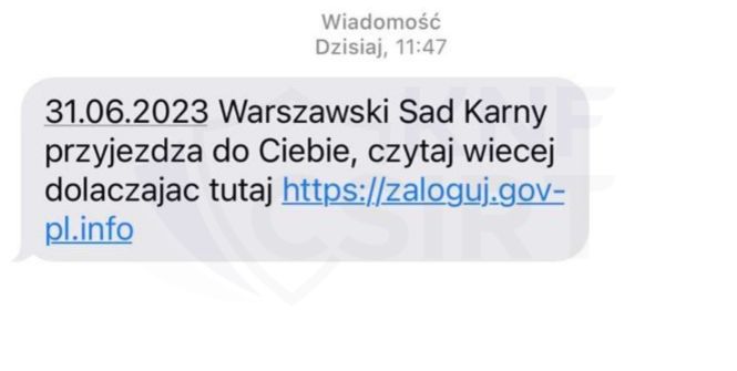 Przykład wiadomości SMS rozsyłanej w ramach kampanii phishingowej, w której przestępcy podszywali się pod Warszawski Sąd Karny (ciekawostka: nie sprawdzili ile dni ma czerwiec) (rys. 12):