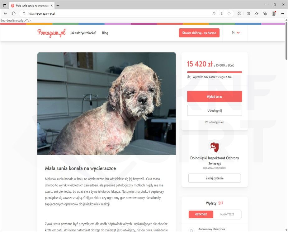 Cyberprzestępcy wykorzystują wizerunek strony zbiórek charytatywnych pomagam.pl przygotowali strony phishingowe rzekomej zbiórki na chore zwierzę. Osoba, która chciała wspomóc rekonwalescencje zwierzęcia w rzeczywistości wykonywała przelew na rachunek bankowy zarządzany przez przestępców.