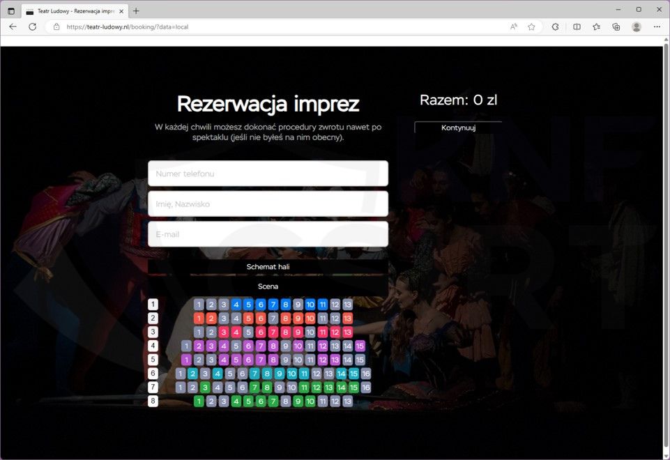KROK 2: Strona phishingowa, ekran po wyborze spektaklu, gdzie wpisywane są dane osobowe oraz wybrane miejsce (rys. 22):