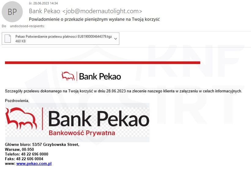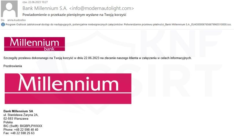 W czerwcu 2023 roku miały miejsce 2 kampanie rozsyłające złośliwe oprogramowanie wykorzystujące wizerunki polskich banków. Przestępcy podszywali się pod Bank Pekao SA oraz Bank Millennium.
