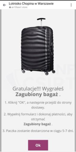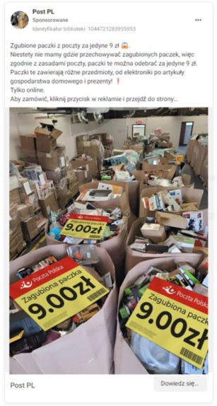 Cyberprzestępcy publikując reklamy na platformie Facebook informowali o rzekomej możliwości wykupienia zagubionej paczku lub porzuconego bagażu za 9 zł. W rzeczowości strona, do której prowadziła reklama miała na celu wyłudzenie danych kart płatniczych. Następnie przestępcy starali się wyprowadzać środki z rachunków, wykorzystując do tego „model subskrypcyjny”.