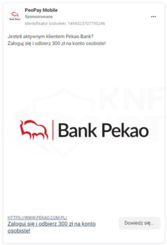Przestępcy podszywając się pod Bank Pekao opublikowali reklamę na platformie Facebook. Pod pretekstem rzekomej możliwości otrzymania zwrotu za zakupy, zachęcali do kliknięcia w link, który prowadził na złośliwą stronę. Na niej ofiara zachęcana była do instalacji fałszywej aplikacji. Analiza wykazała, że złośliwa aplikacja była przygotowana w technologii PWA/WebAPK. Otwarcie aplikacji powodowało próbę załadowania w trybie pełnoekranowym adresu strony phishingowej. Kampania ta miała prawdopodobnie na celu wyłudzanie danych uwierzytelniających do bankowości elektronicznych.