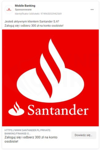 Przestępcy wykorzystują wizerunek znanych instytucji, aby zwiększać wiarygodność kampanii phishingowych, dlatego też regularnie podszywają się pod polskie Banki. Wyłudzają w ten sposób informacje o kartach płatniczych oraz dane uwierzytelniające do bankowości elektronicznej, jak i zachęcają do pobierania złośliwych aplikacji. W maju 2024 roku przestępcy nadal wykorzystywali ten sposób działania, wykorzystując do dystrybucji stron phishingowych reklamy w mediach społecznościowych oraz wiadomości e-mail.