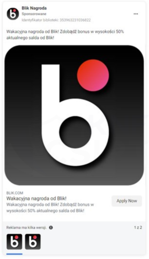 Cyberprzestępcy podszywając się pod firmę BLIK, informowali o rzekomej możliwości odebrania nagrody. Do dystrybucji stron phishingowych wykorzystali reklamy na platformie Facebook. W rzeczywistości wyłudzali kody BLIK.