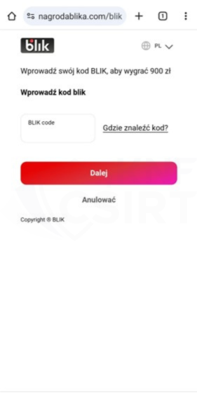 Strona phishingowa wyłudzająca kody BLIK (rys. 10):