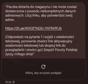 rys. 16 Wiadomość SMS podszywjąca się pod Pocztę Polska