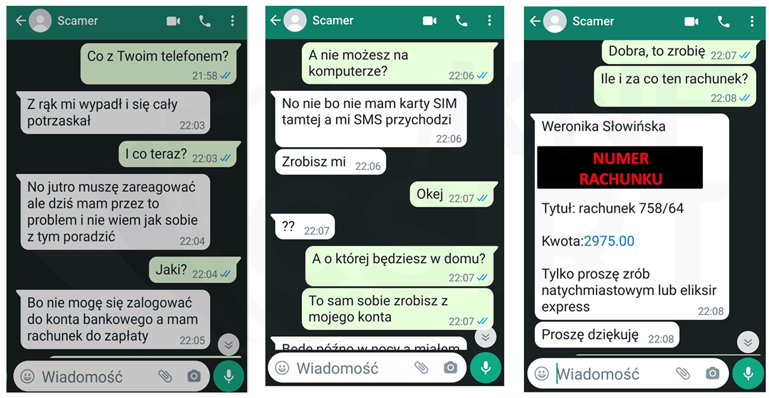 Przestępcy przygotowali kampanię phishingową, w której podszywając się pod członka rodziny, rozsyłali wiadomości SMS, prosząc o kontakt poprzez WhatsApp, wykorzystując link, który podawali w wiadomości SMS. Następnie prowadzili konwersację tekstową, podczas której przekonywali do zrobienia przelewu na podany przez nich numer rachunku. Były to konta bankowe zarządzane przez przestępców.