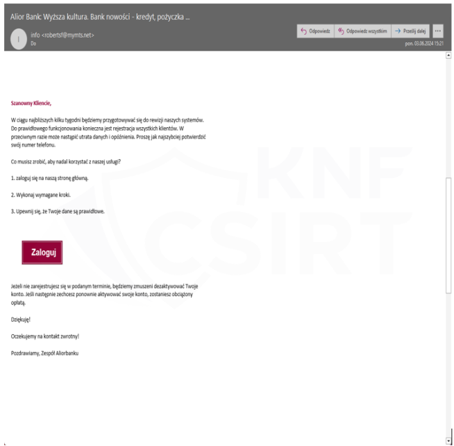 Przykładowy wygląd wiadomości e-mail, podszywającej się pod Alior Bank (rys. 3):