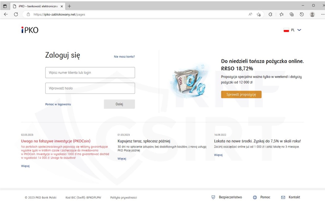 Cyberprzestępcy podszywając się pod bank PKO BP rozsyłali wiadomości SMS informując o rzekomym zablokowaniu dostępu do usług bankowości i potrzebie ponownego aktywowania konta. W wiadomości znajdował się link, który kierował na stronę phishingową. Przestępcy starali się pozyskać dane uwierzytelniające do bankowości elektronicznej. Kampania przestępcza o dokładnie takim samym scenariuszu, była opisywana przez nas m.in. w miesięcznym raporcie „Ochrona klienta” z luteg’23. Cyberprzestępcy podszywali się wtedy pod trzy inne banki.