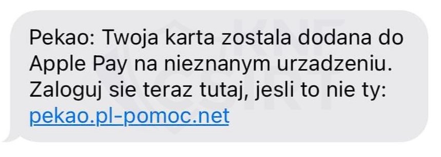 Cyberprzestępcy podszywając się pod markę Pekao SA rozsyłali wiadomości SMS informując o rzekomym dodaniu karty do portfela Apple Pay, nieznanym urządzeniu. W wiadomości znajdował się link, po kliknięciu, którego potencjalna ofiara trafiała na stronę phishingową. Przestępcy starali się pozyskać dane uwierzytelniające do bankowości elektronicznej.