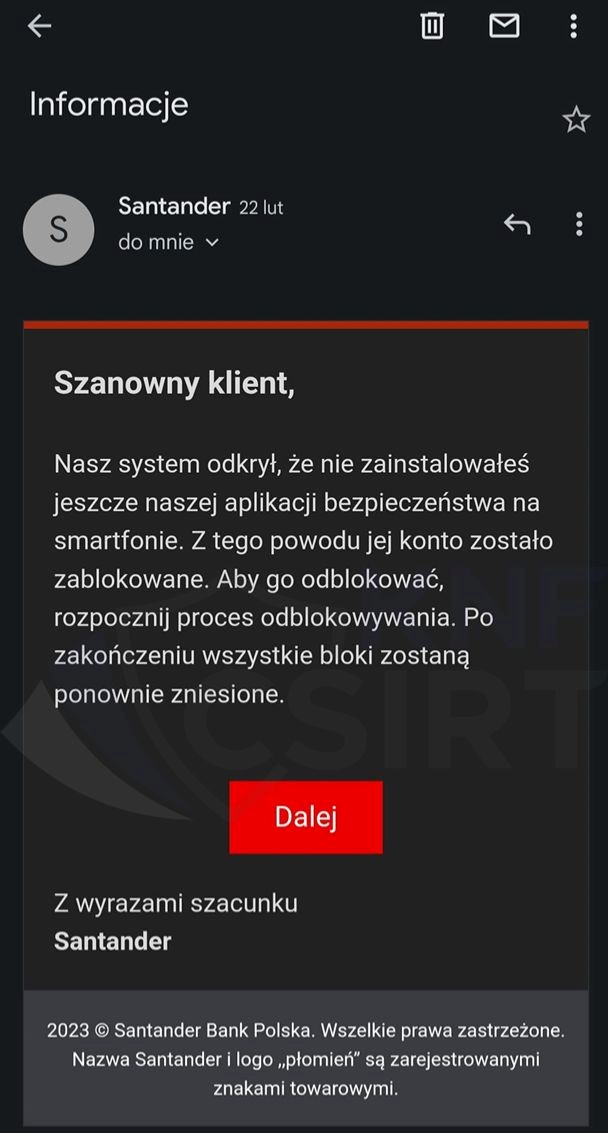FAŁSZYWE WIADOMOŚCI E-MAIL PODSZYWAJĄCE SIĘ POD SANTANDER BANK POLSKA - INSTALACJA APLIKACJI BEZPIECZEŃSTWA