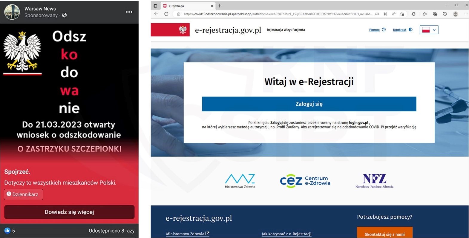 Cyberprzestępcy ponownie wrócili do tematyki pandemicznej. Tym razem zamieścili fałszywe reklamy z informacją o rzekomej możliwości otrzymania odszkodowania za szczepienie. Aby uwiarygodnić swoje działania wykorzystali wizerunek Narodowego Funduszu Zdrowia oraz ministerstwa Zdrowia. W informacji znajdował się przycisk po kliknięciu, którego potencjalna ofiara trafiała na stronę phishingową. Przestępcy starali się pozyskać dane kart płatniczych.