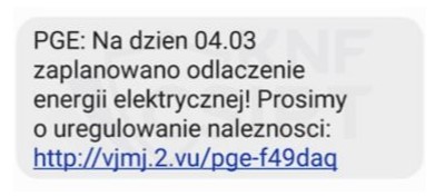 - dostawcę energii PGE, informując o rzekomo planowanym odłączeniu energii elektrycznej i konieczności uregulowania należności;