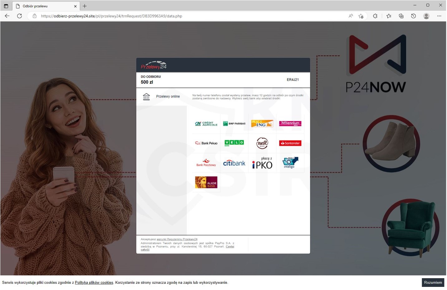 - pośrednika płatności Przelewy24, informując o rzekomym przelewie do odbioru;