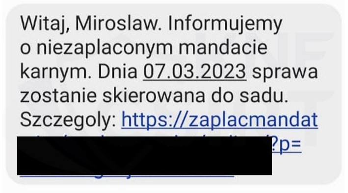 Przykład wiadomości SMS rozsyłanej przez przestępców (rys. 12):