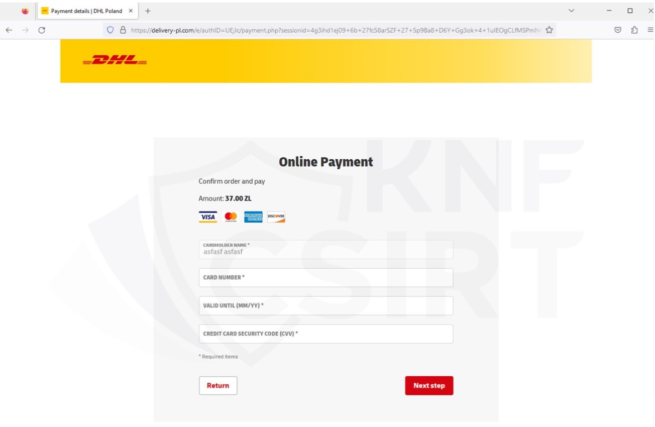 Cyberprzestępcy podszywając się pod firmę kurierską DHL rozsyłali wiadomości SMS informując o rzekomym wysłaniu zamówienia. W wiadomości znajdował się link, po kliknięciu w niego ofiara trafiała na stronę, na której zachęcana była do wprowadzenia imienia i nazwiska oraz danych karty płatniczej (pełen numer, data ważności, kod CVV), kodów 3DSecure.