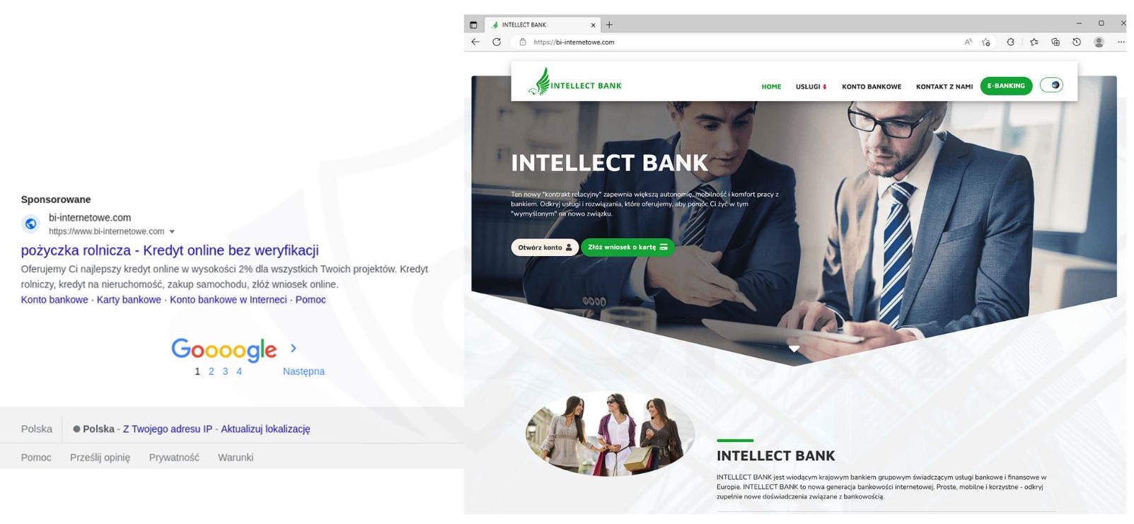 Rysunek 35 Reklama w Google oraz strona fałszywego banku