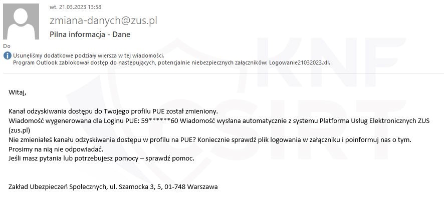 Rozsyłane były wiadomości z wykorzystaniem e-mail spoofing (rys. 39). W załączniku znajdował się plik o nazwie „Logowanie21032023.xll”, który był plikiem typu Microsoft Excel Add-In, udostępniającym programistom C API programu Excel.