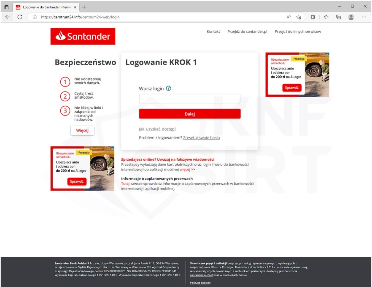 Rysunek 7 Fałszywa strona podszywająca się pod Santander Bank Polska