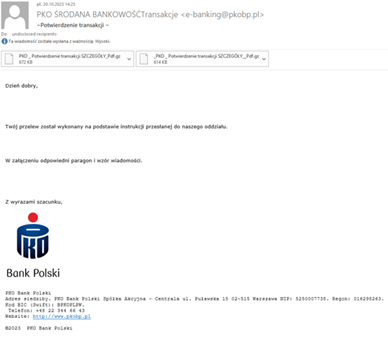 W październiku 2023 roku miały miejsce 2 kampanie rozsyłające złośliwe oprogramowanie wykorzystujące wizerunek Bank PKO BP (rys. 37-38).