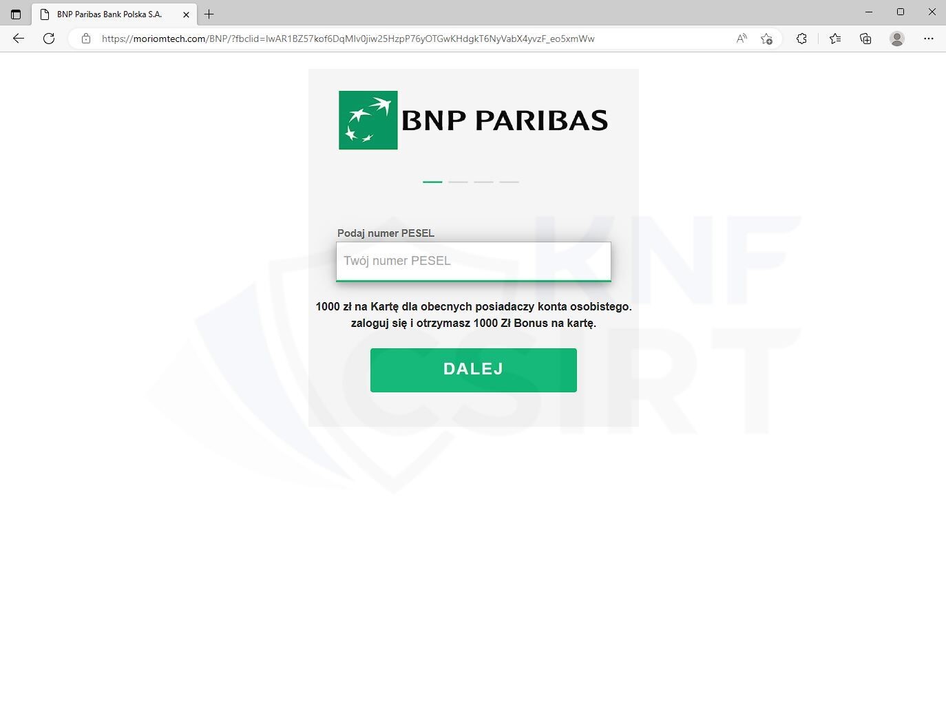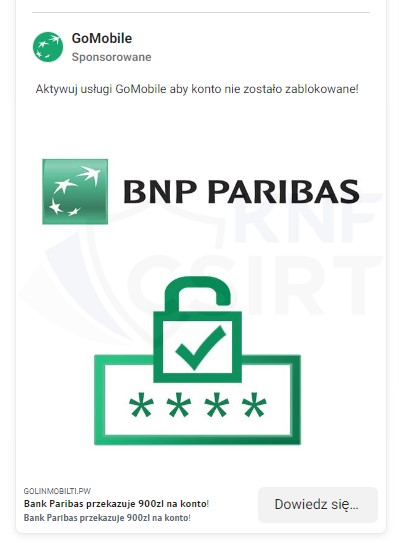 Cyberprzestępcy podszywając się pod Bank BNP Paribas zamieszczali fałszywe reklamy w mediach społecznościowych, w których informowali o rzekomej możliwości otrzymania środków na zakupy dla klientów banku. Dalej użytkownik dowiadywał się, że nagroda zostaje przydzielona na aktywację usługi BLIK. Po kliknięciu w link przekierowywany był on na stronę wyłudzającą jego dane osobowe oraz dane logowania do bankowości elektronicznej.
