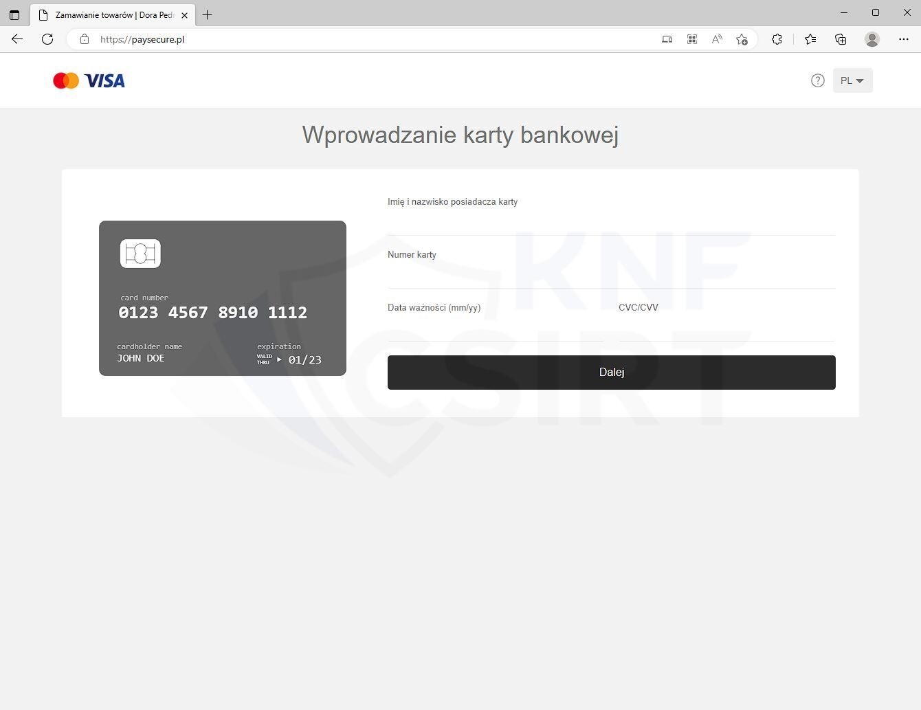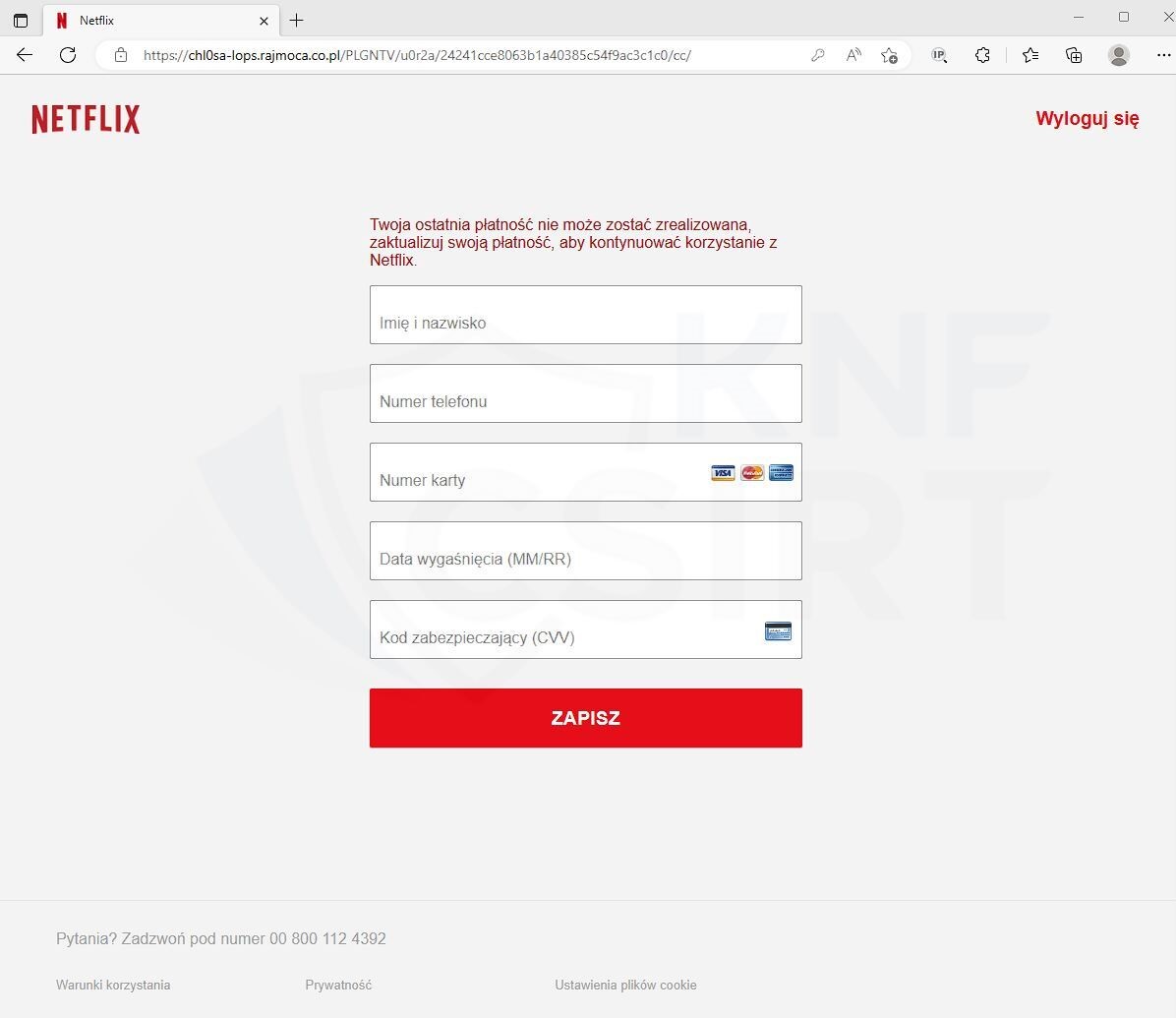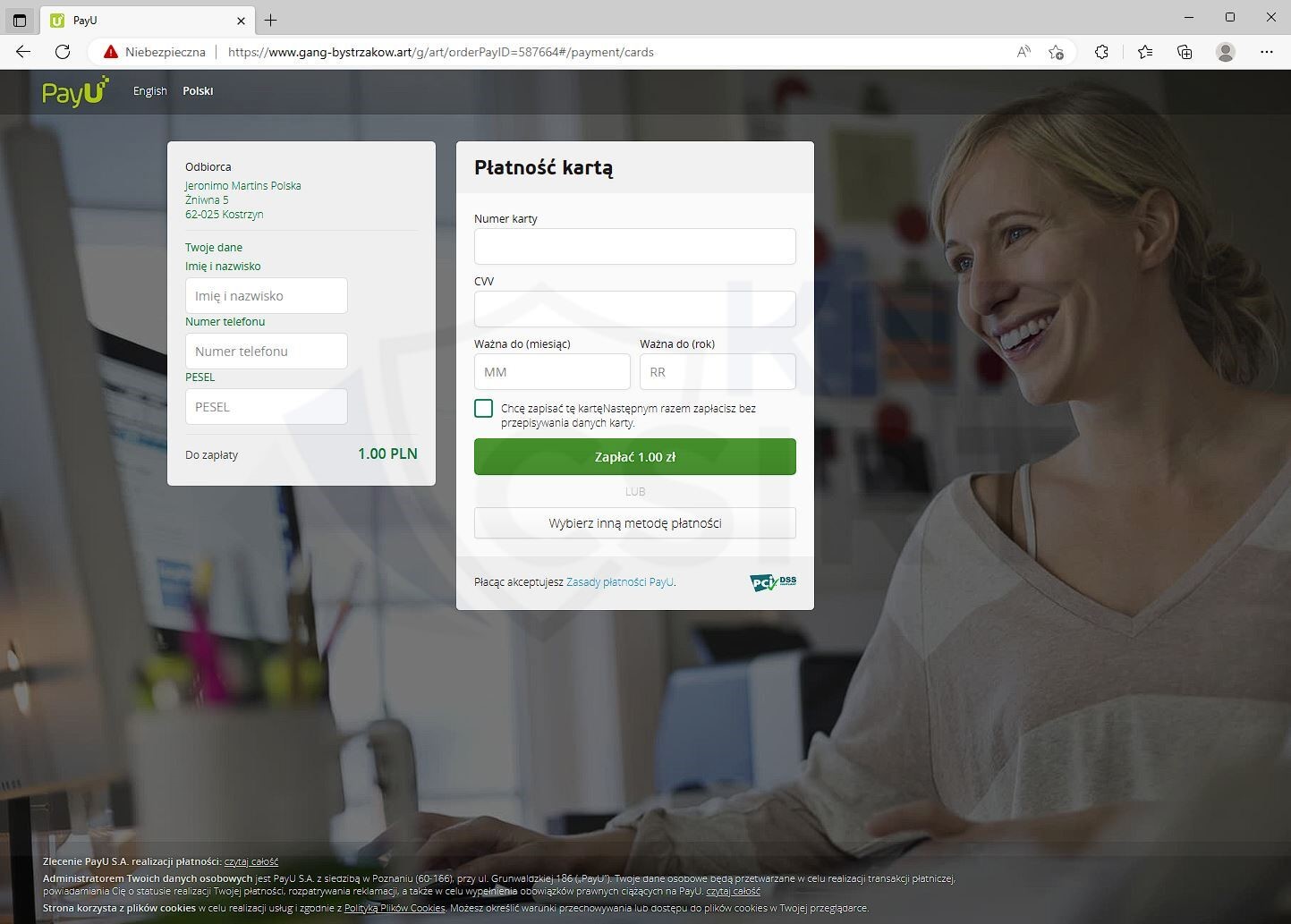 Strona wyłudzająca dane osobowe ofiary oraz dane karty płatniczej: