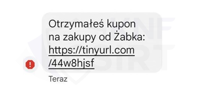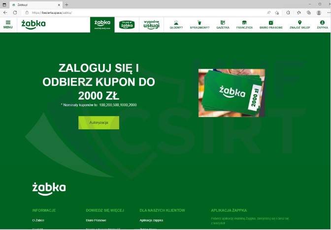 Cyberprzestępcy podszywając się pod sieć sklepów Żabka rozsyłali wiadomości SMS informując o rzekomym otrzymaniu kuponu na zakupy. W wiadomości znajdował się tzw. „skracacz” linku, który docelowo kierował na stronę phishingową. Na fałszywej stronie potencjalna ofiara dowiadywała się o otrzymaniu kuponu w wysokości 2 000 PLN, pod warunkiem zalogowania do bankowości elektronicznej i/lub podania danych karty płatniczej.