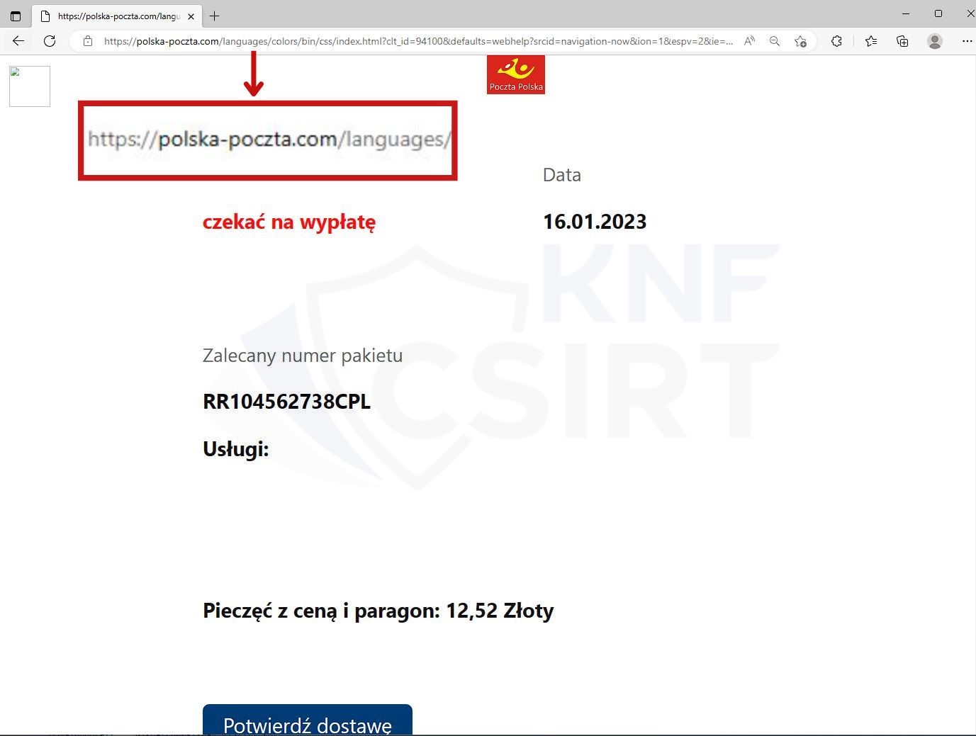 Cyberprzestępcy podszywając się pod markę Poczty Polskiej rozsyłali wiadomości e-mail informując o rzekomym otrzymaniu listu poleconego oraz potrzeby potwierdzenia odbioru wraz z koniecznością dopłacenia za przesyłkę 12,52 zł. W wiadomości znajdował się przycisk „Potwierdź dostawę”, po kliknięciu, którego potencjalna ofiara trafiała na stronę phishingową. Przestępcy starali się pozyskać dane osobowe, informacje dotyczące karty płatniczej oraz kodów 3DSecure, potwierdzających operację.