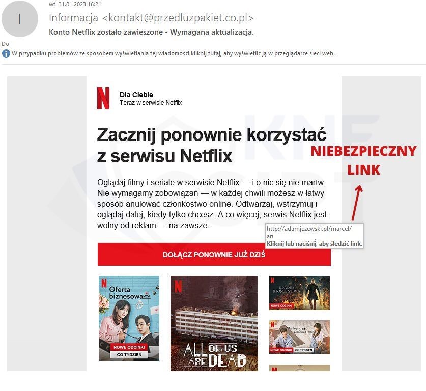 Cyberprzestępcy podszywając się pod Netflix rozesłali wiadomości e-mail informujące o możliwości ponownego przystąpienia do członkostwa do serwisu. W wiadomości znajdował się przycisk „dołącz ponownie już dziś” po kliknięciu, którego potencjalna ofiara trafiała na stronę phishingową. Przestępcy starali się pozyskać dane logowania do serwisu Netflix potencjalnej ofiary oraz informacje dotyczące jej karty płatniczej.