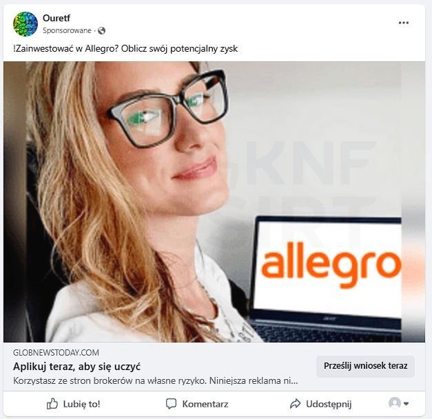 Cyberprzestępcy podszywając się pod serwis sprzedażowy Allegro zamieszczali fałszywe reklamy w mediach społecznościowych, w których zachęcali użytkowników do zainwestowania środków finansowych. Po kliknięciu w link potencjalna ofiara trafiała na stronę, na której wymagane było dokonanie rzekomej rejestracji. Dane pozyskane przez cyberprzestępców w ten sposób umożliwiały im nawiązanie kontaktu z osobą, która była już w pewnym stopniu zmanipulowana. Następnie przestępcy mieli na celu kradzież środków z rachunku.
