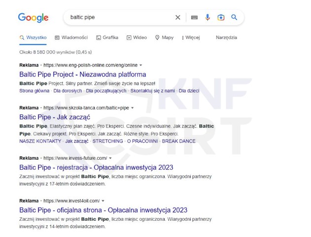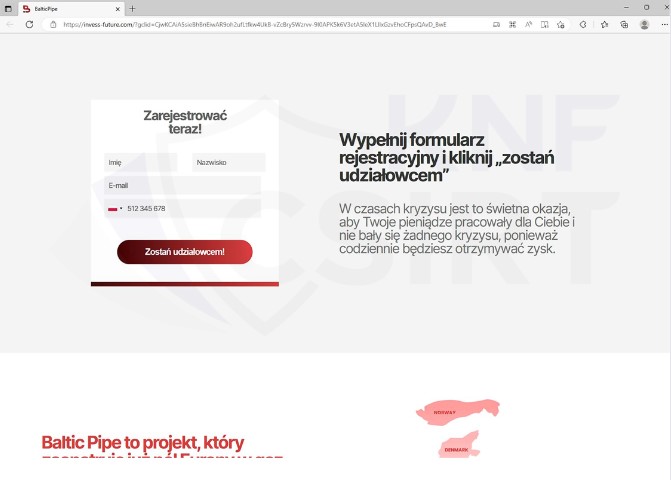 Cyberprzestępcy podszywając się pod Baltic Pipe zamieszczali fałszywe reklamy w wyszukiwarce Google, w których zachęcali użytkowników do zainwestowania środków finansowych. Po kliknięciu w link klient trafiał na stronę, na której wymagane było dokonanie rejestracji. Dane pozyskane przez cyberprzestępców w ten sposób umożliwiały im nawiązanie kontaktu z potencjalną, już zmanipulowaną osobą, a w kolejnym kroku kradzież jej środków. Niejednokrotnie, w podobnych przypadkach, przestępcy zachęcali do instalowania oprogramowania do zdalnej obsługi urządzenia, więcej o tym schemacie pisaliśmy w artykule: https://cebrf.knf.gov.pl/komunikaty/artykuly-csirt-knf/362-ostrzezenia/852-66-latka-stracila-prawie-190-tysiecy-zlotych-inwestujac-na-falszywej-platformie