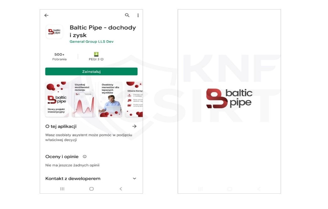 Oszuści tworzą również fałszywe aplikacje podszywające się pod Baltic Pipe przeznaczone na urządzenia mobilne z systemem Android, które zamieszczają w sklepie Google Play. Cyberprzestępcy zachęcają do ich pobrania zapewniając, że zainwestowanie środków przyniesie szybkie zyski w krótkim czasie.