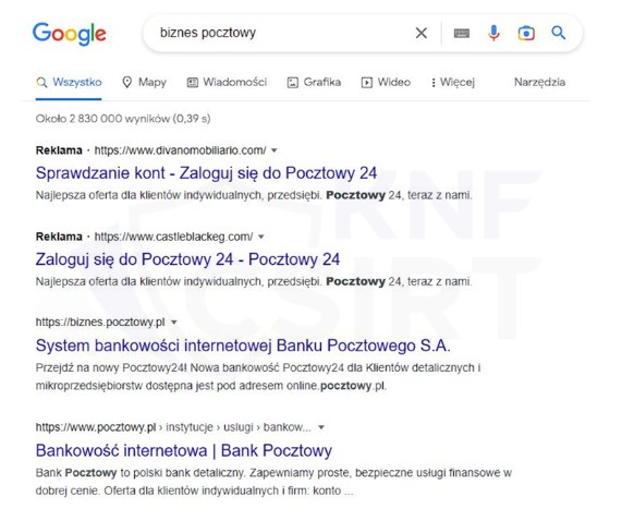 Cyberprzestępcy podszywając się pod Bank Pocztowy zamieszczali w wyszukiwarce Google fałszywe reklamy. Po kliknięciu w link klient trafiał na fałszywą stronę bankowości elektronicznej, na której wyłudzane były poświadczenia logowania do bankowości elektronicznej.