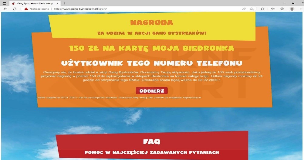 Cyberprzestępcy podszywając się pod sieć Biedronka rozsyłali wiadomości SMS informując o rzekomym otrzymaniu nagrody w wysokości 150 zł. Po kliknięciu w link potencjalna ofiara trafiała na stronę odbioru nagrody, a następnie na stronę imitującą pośrednika płatności PayU, gdzie proszona była o wypełnienie danych osobowych oraz wybór Banku, w którym posiada rachunek lub panel do wpisania danych karty płatniczej. Kolejnymi krokami były fałszywe domeny bankowości elektronicznej, gdzie ofiara wpisywała dane logowania.