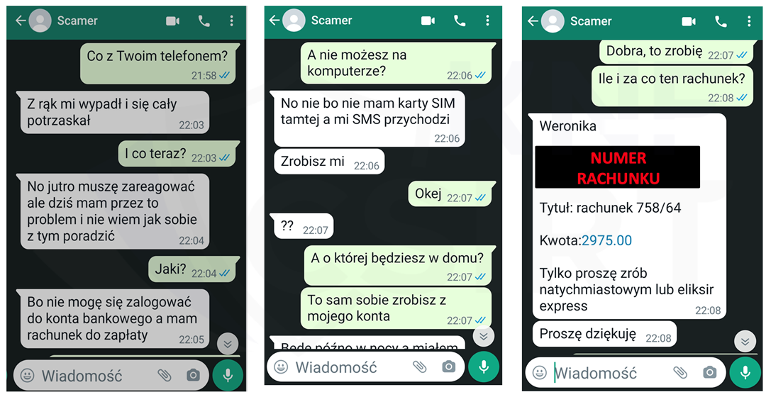Gdy odbiorca wiadomości SMS nawiąże kontakt za pośrednictwem komunikatora WhatsApp cyberprzestępcy, podszywając się pod członka rodziny poinformują o: