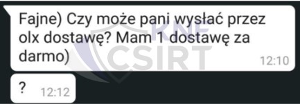 Kontakt odbywa się najczęściej poprzez komunikator WhatsApp, zdarzają się jednak również inne formy kontaktu przestępcy z ofiarą. Wystawiający ogłoszenie (ofiara) dostaje taką propozycję przeprowadzenia transakcji, w której będzie miał możliwość „odebrania zapłaty za przedmiot/usługę” (rys. 2).
