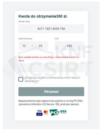 - potrzeba wpisania obecnego salda rachunku ofiary, tłumaczona przez przestępcę koniecznym procesem weryfikacji, aby odebrać środki (rys. 7), to sposób na pozyskanie informacji ile pieniędzy znajduje się na koncie ofiary, w sytuacji, kiedy przestępcy wyłudzają tylko dane kart płatniczych i nie mają dostępu do bankowości internetowej,